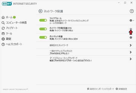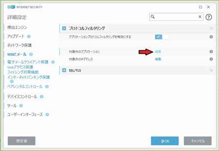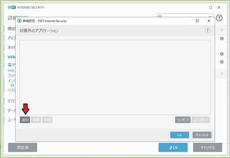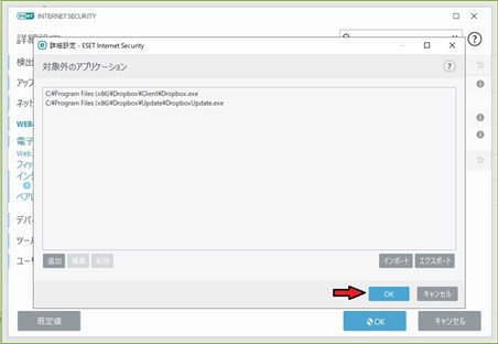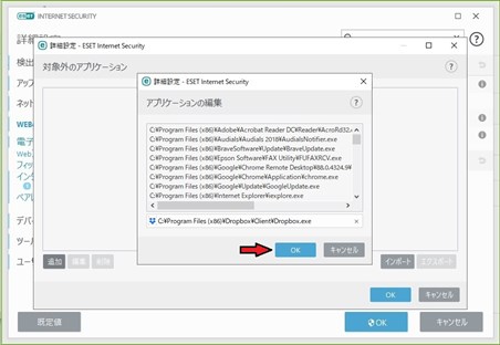 eset_drpbox01_R.jpg | セキュリティーにESET internet security Ver.13以上をインストールしている場合 ①設定をクリック ②ネットワーク保護をクリック ③ネットワーク攻撃保護(IDS)の設定(ギヤ)マークをクリック ④Webとメールをクリック ⑤+プロトコルフィルタリングをクリックしてコンテンツをプルダウン ⑥対象外のアプリケーション 「編集」をクリック ⑦追加をクリックしてDropbox.exeとDropboxUpdate.exeを探してそれぞれ追加登録する。 ⑧OKボタンと赤×で設定終了。ESETの更新作業が完了すればドロップボックスへの干渉は解除される。 |