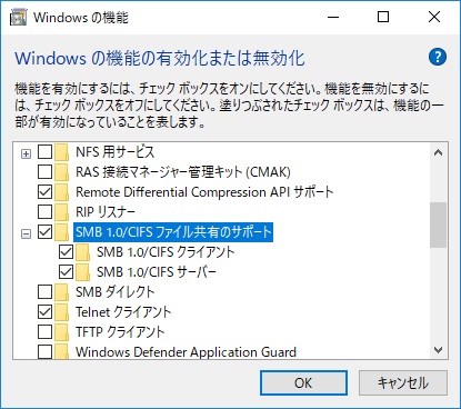 ①「SMB 1.0/CIFS ファイル共有のサポート」のチェックおよび高速スタートアップを無効にする |